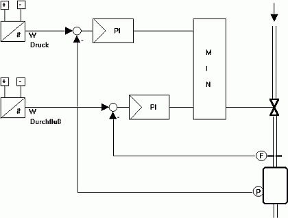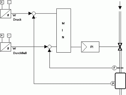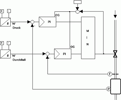 Bild 2.1 zeigt den klassischen Aufbau einer Ablöseregelung am Beispiel einer Durchfluss- und Druck-Regelung. Durch die Minimum-Auswahl