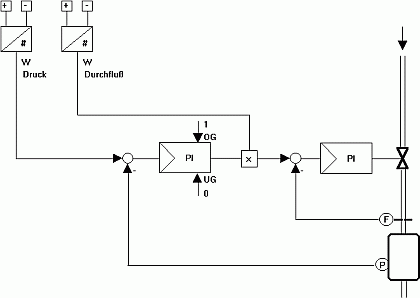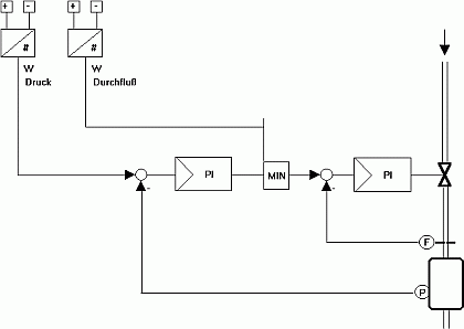 Durchfluss-Sollwert abgezogen. Die Subtraktion erfordert eine Umkehrung des Regelsinnes im Druck-Regler. Der Druck-Regler ist hierbei mit